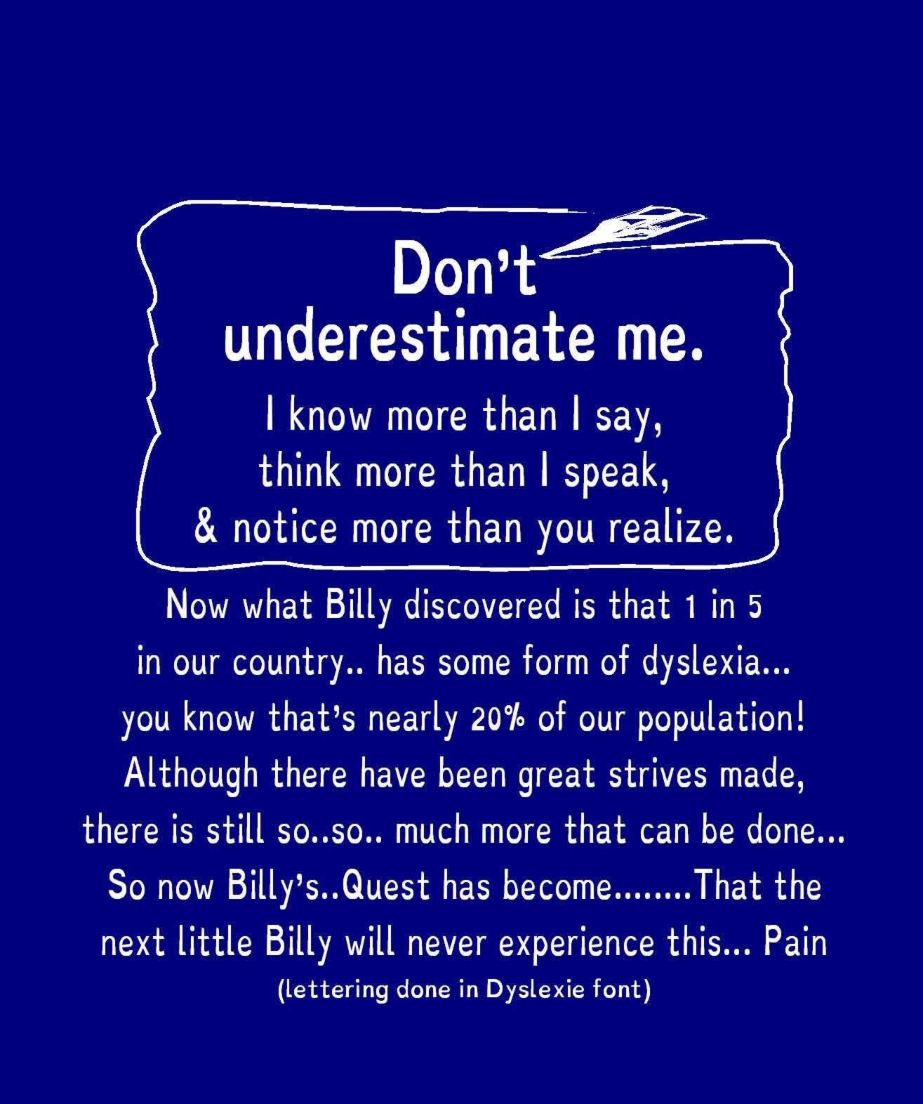 Below is our Billy's Quest tee-shirt using the Radio Flyer wagon as the toolbox children dreamed of having the Radio Flyer wagon to hold and carry their treasures! A place that can carry them to their imaginations wildest destinations and their dreams come true! This was my son Daniel's idea! The 1st tool and most important tool "I will never be Ashamed" The reason for so much information on the Billy's Quest tee-shirt. My thoughts are we should be wearing it to say the grocery store? Where your standing in line giving the person behind you time to read that 1in5 that's 20% of our population has some form of dyslexia! At this point it can be explained yes estimated 20% from mild to severe This is all about being able to start meaningful conversation about what needs to be done for our children.