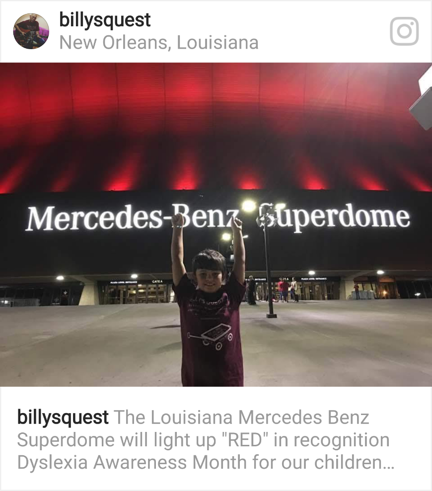 This will be our second year that the Mercedes-Benz Superdome in New Orleans will light up "RED" in Recognition of Dyslexia Awareness Month for our Children. This year Sunday October 22,2017 at dusk the lights will turn "RED" once again in recognition of our dyslexic children! We will have a Ceremony 6:00-7:30 A certificate of Recognition "Kids with Dyslexia" from New Orleans Mayor Landrieu office. Also our dyslexic children will receive letters of the journeys from our Billy's Quest Hero's both the good and bad and how they handle the trails and tribulations daily! Everyone is invited if you know a dyslexic child please invite along with family and friends to attend. Please come out an support our dyslexic children! Will be held on the landing ( two large ramps lead up to the landing) at the front entrance of the PLEASE WEAR "RED" Oh...... the smiling face of determination with arms raised to the sky is Gavin Cardoza one of our amazing Billy's Quest Hero's! Gavin you ROCK!